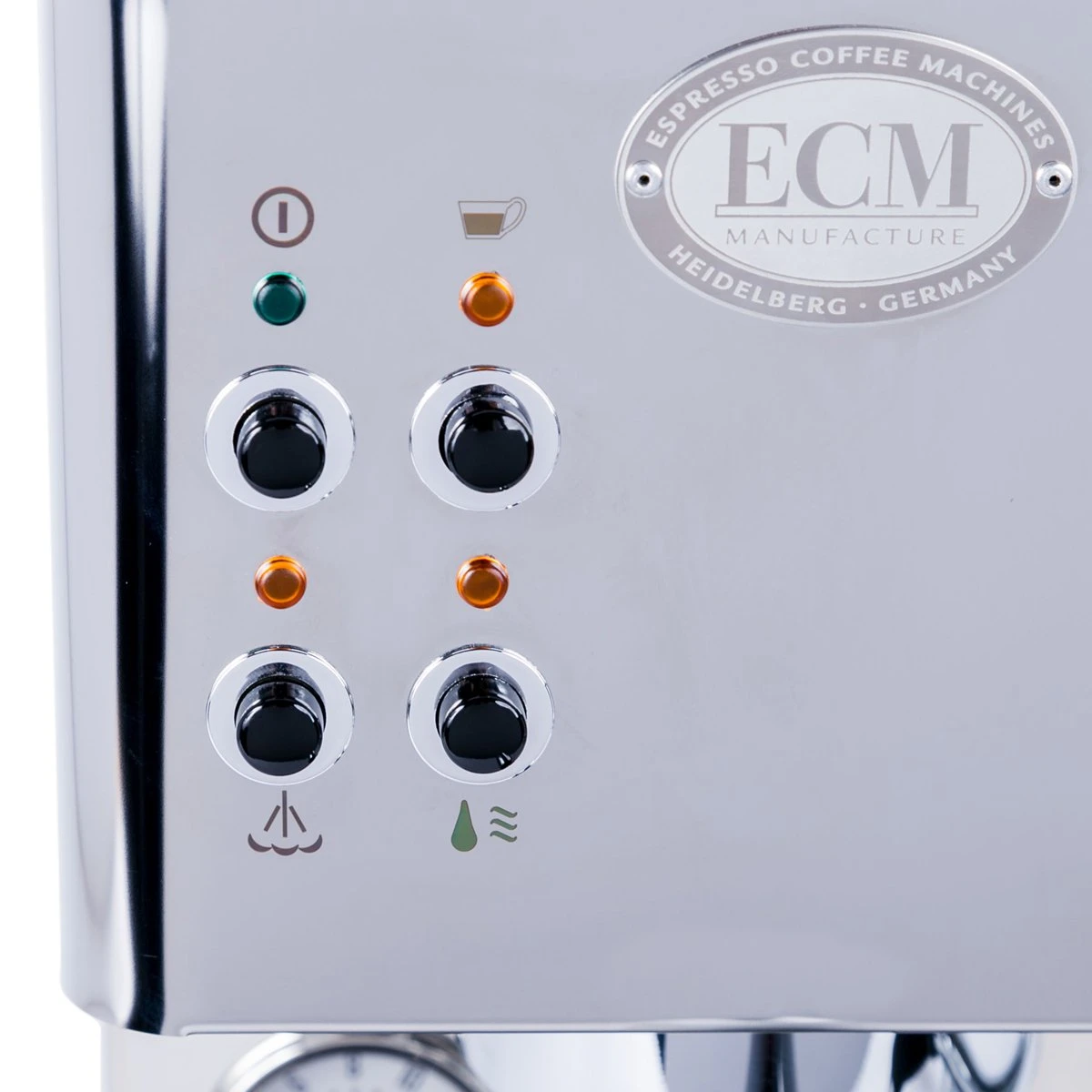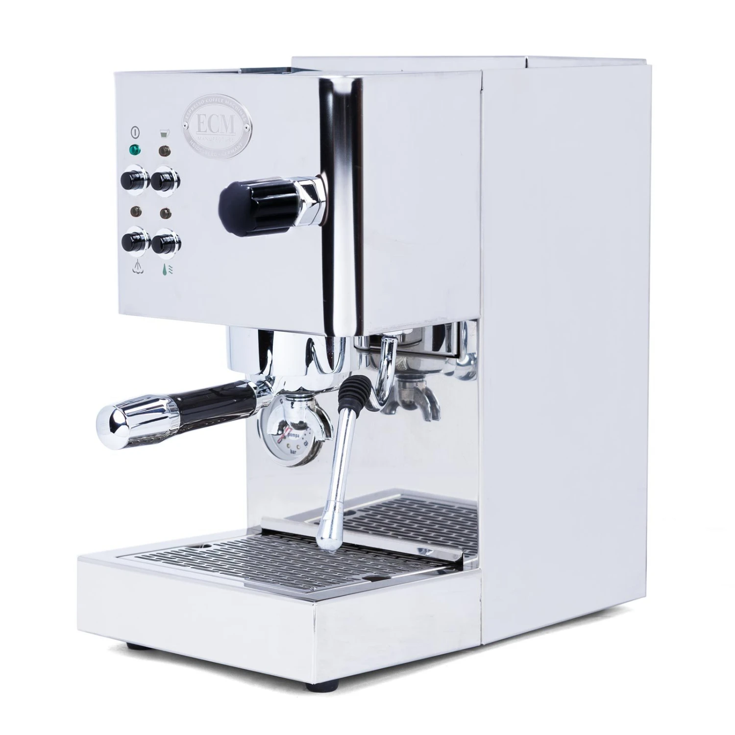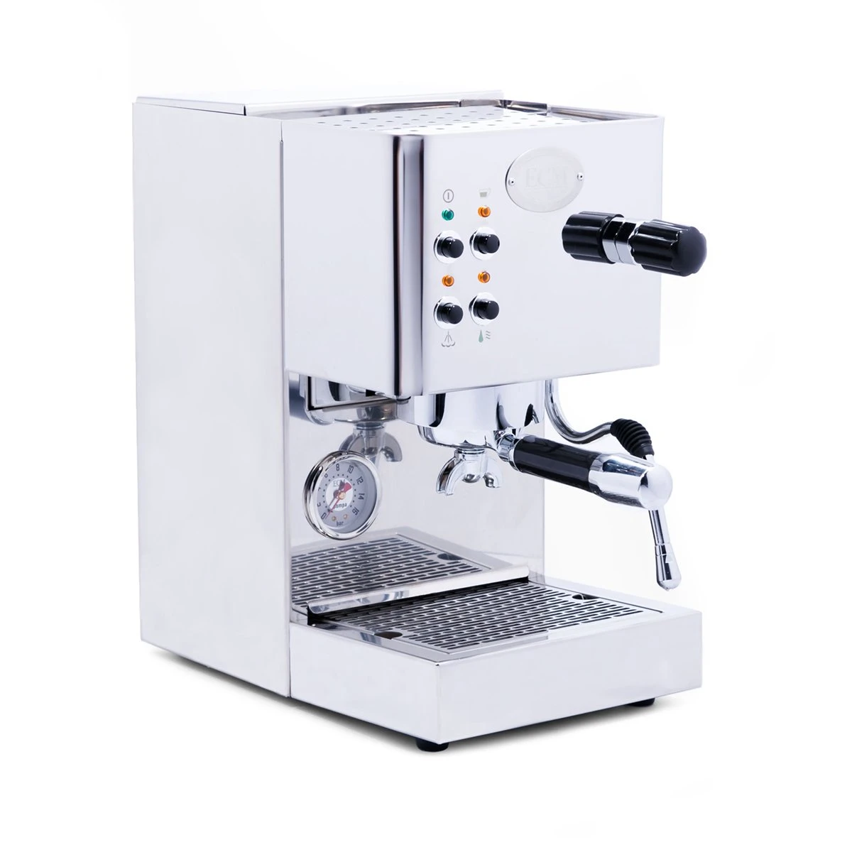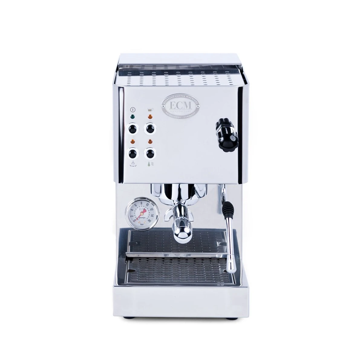 The ECM Casa V is a single boiler espresso machine with a vibratory pump, a saturated group head, and a no-burn insulated steam wand. It runs on its 3-liter internal reservoir.
