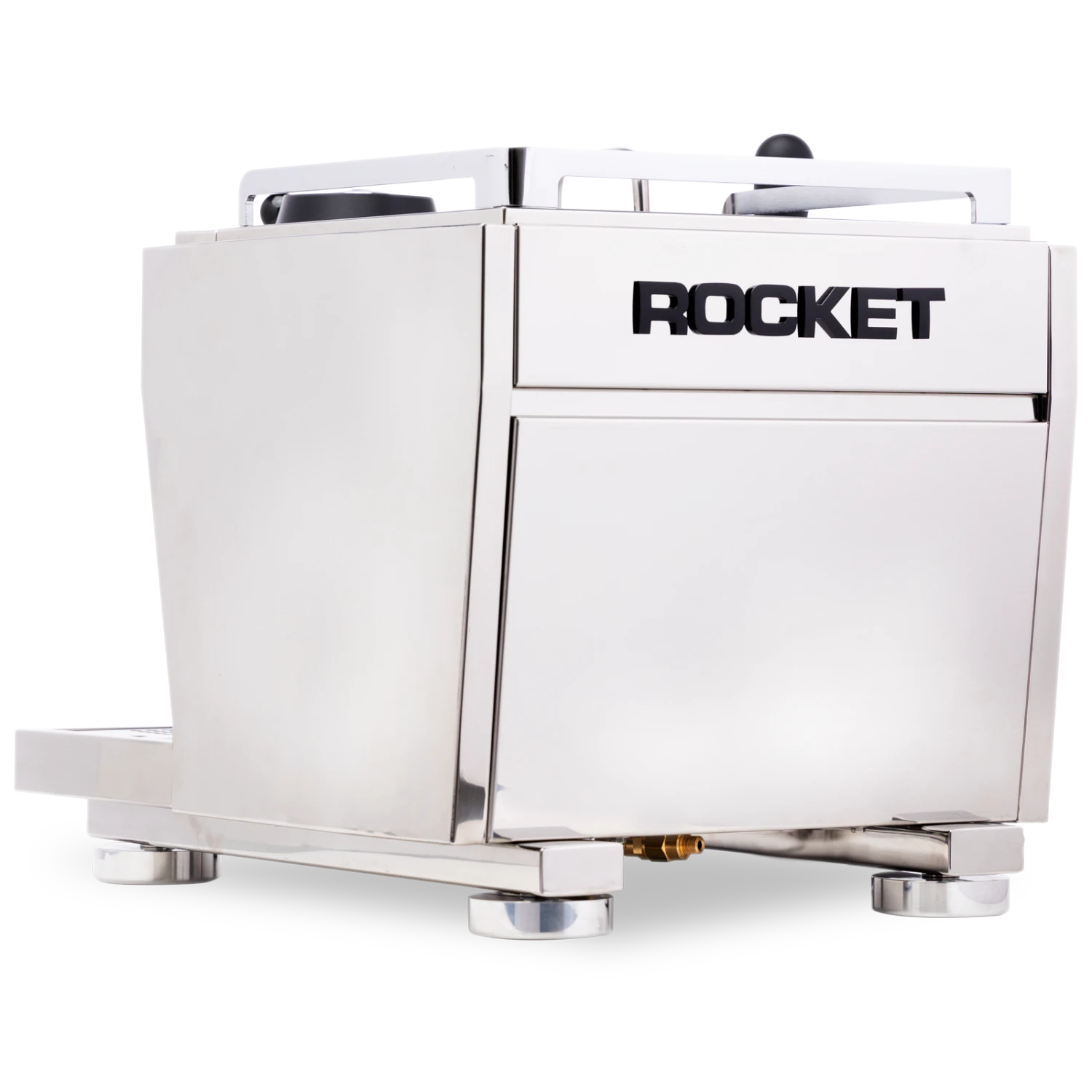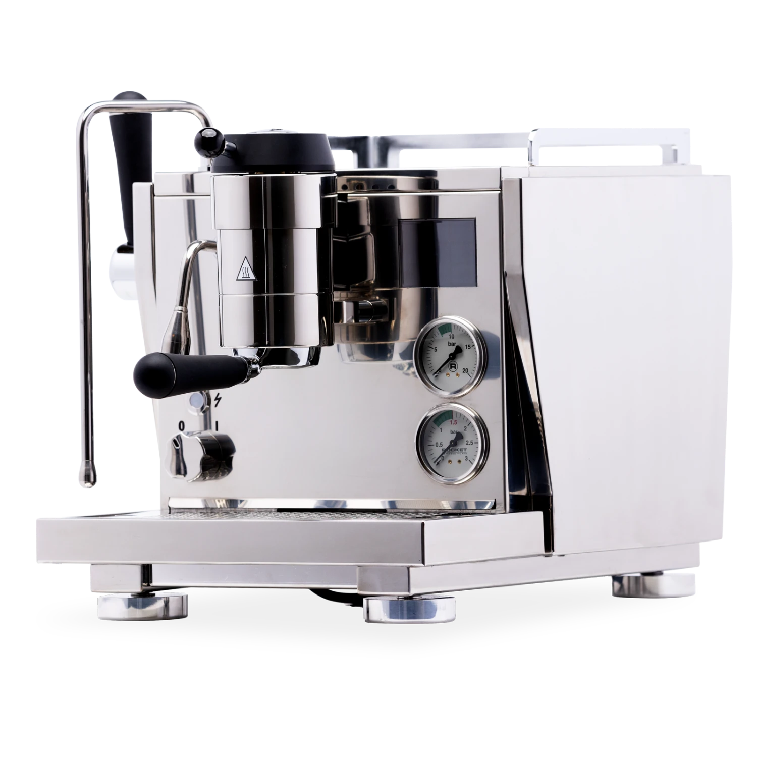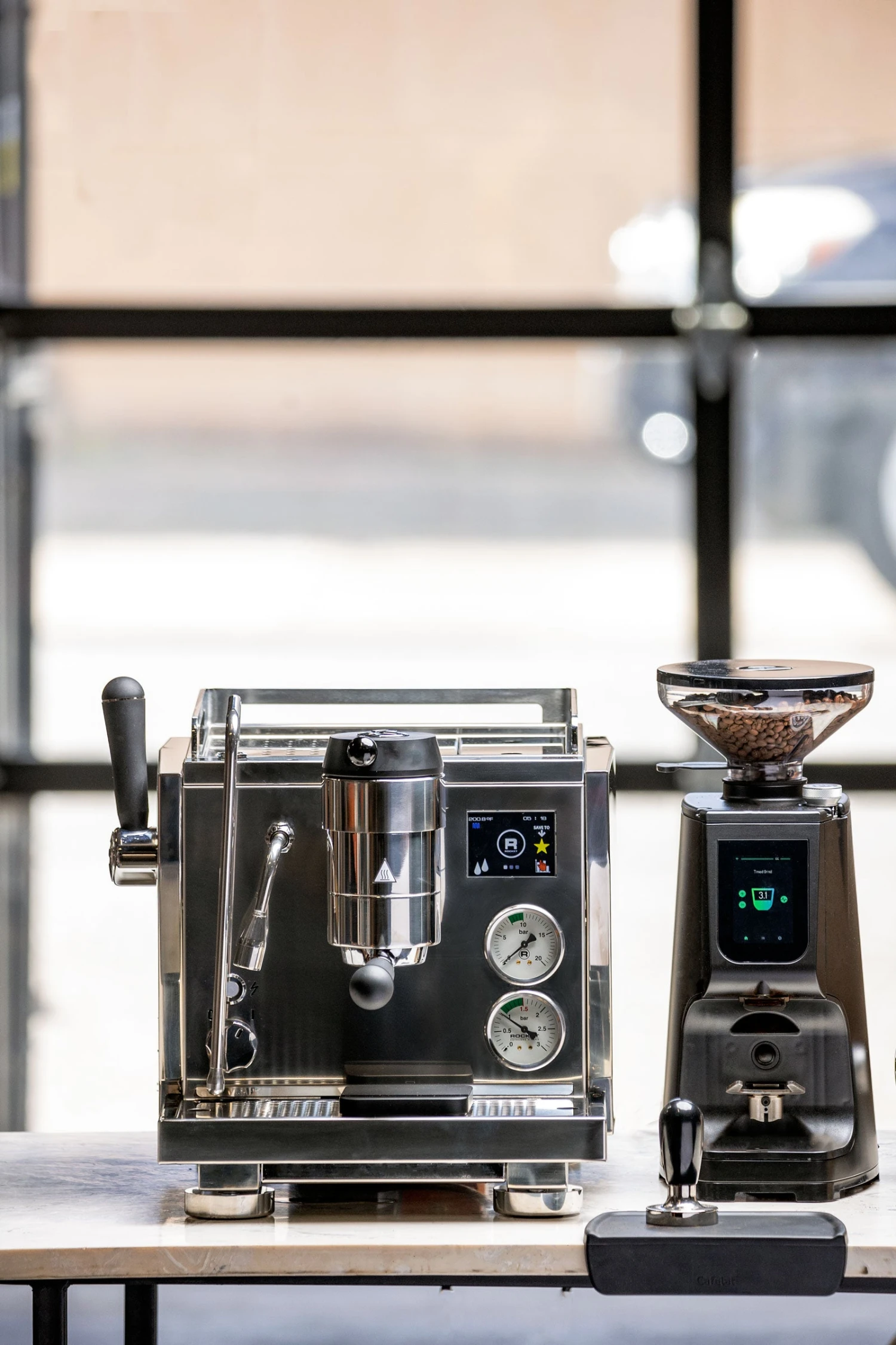 The Rocket R Nine One is a dual boiler espresso machine with a saturated group head, PID temperature control, shot timer, and a rotary pump that can be direct plumbed or run on its internal reservoir. It features manual and programmable pressure profiling, allowing you to save up to 5 coffee recipes via the control knob or the color touchscreen.