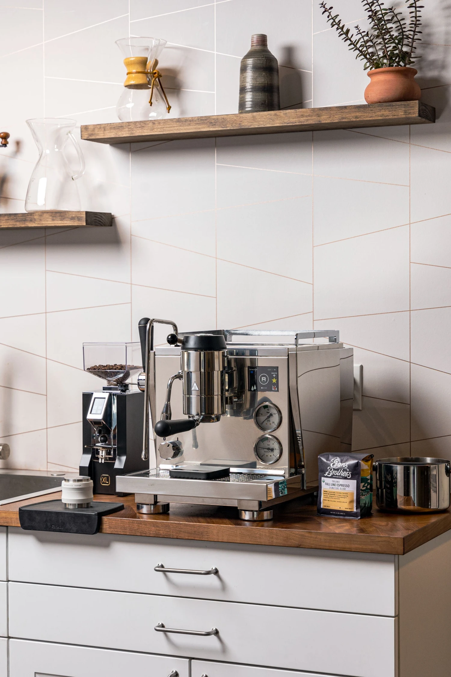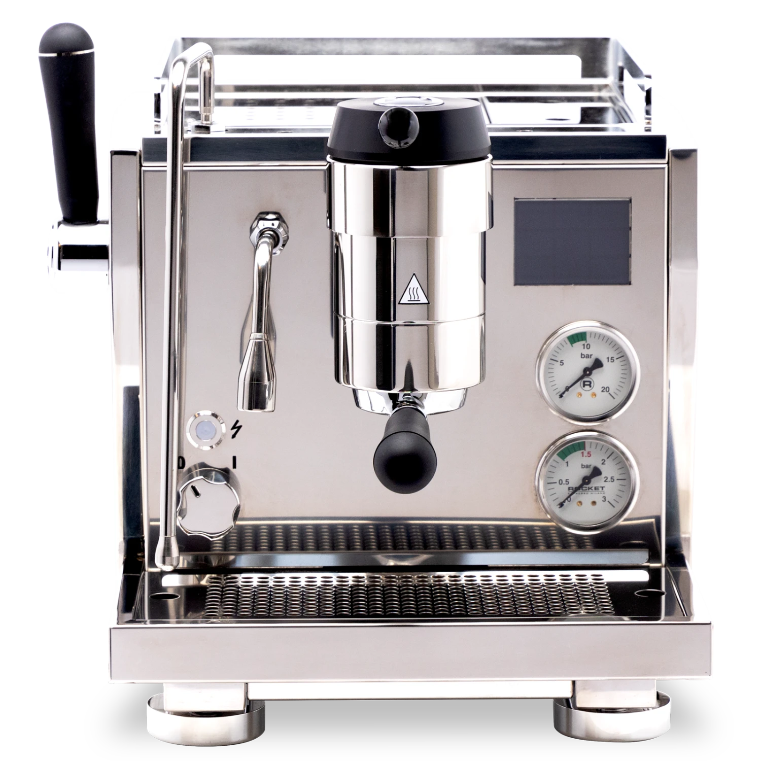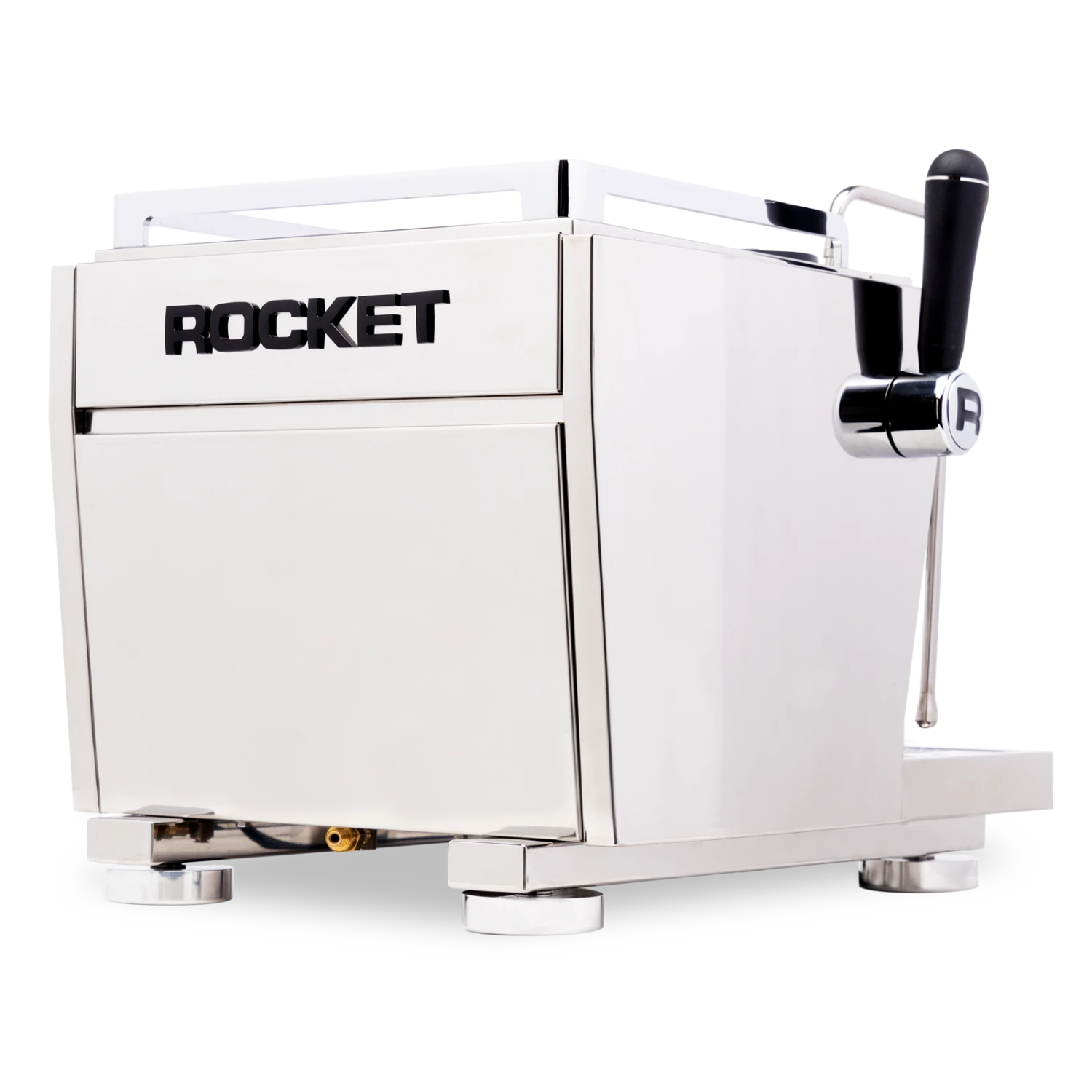 The Rocket R Nine One is a dual boiler espresso machine with a saturated group head, PID temperature control, shot timer, and a rotary pump that can be direct plumbed or run on its internal reservoir. It features manual and programmable pressure profiling, allowing you to save up to 5 coffee recipes via the control knob or the color touchscreen.
